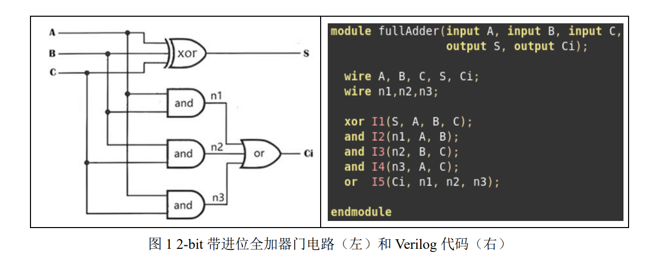 用以实现基本逻辑运算和复合逻辑运算的单元电路称为门电路。常用的门电路在逻辑功能上有与门、或门、非门、与非门、或非门、异或门、异或非门等几种。通常门电路为多输入、单输出结构,多个门电路按照一定规则组合在一起可实现具有特定功能的组合逻辑电路,例如下图为 2-bit 带进位全加器的门级电路图和 Verilog 代码。