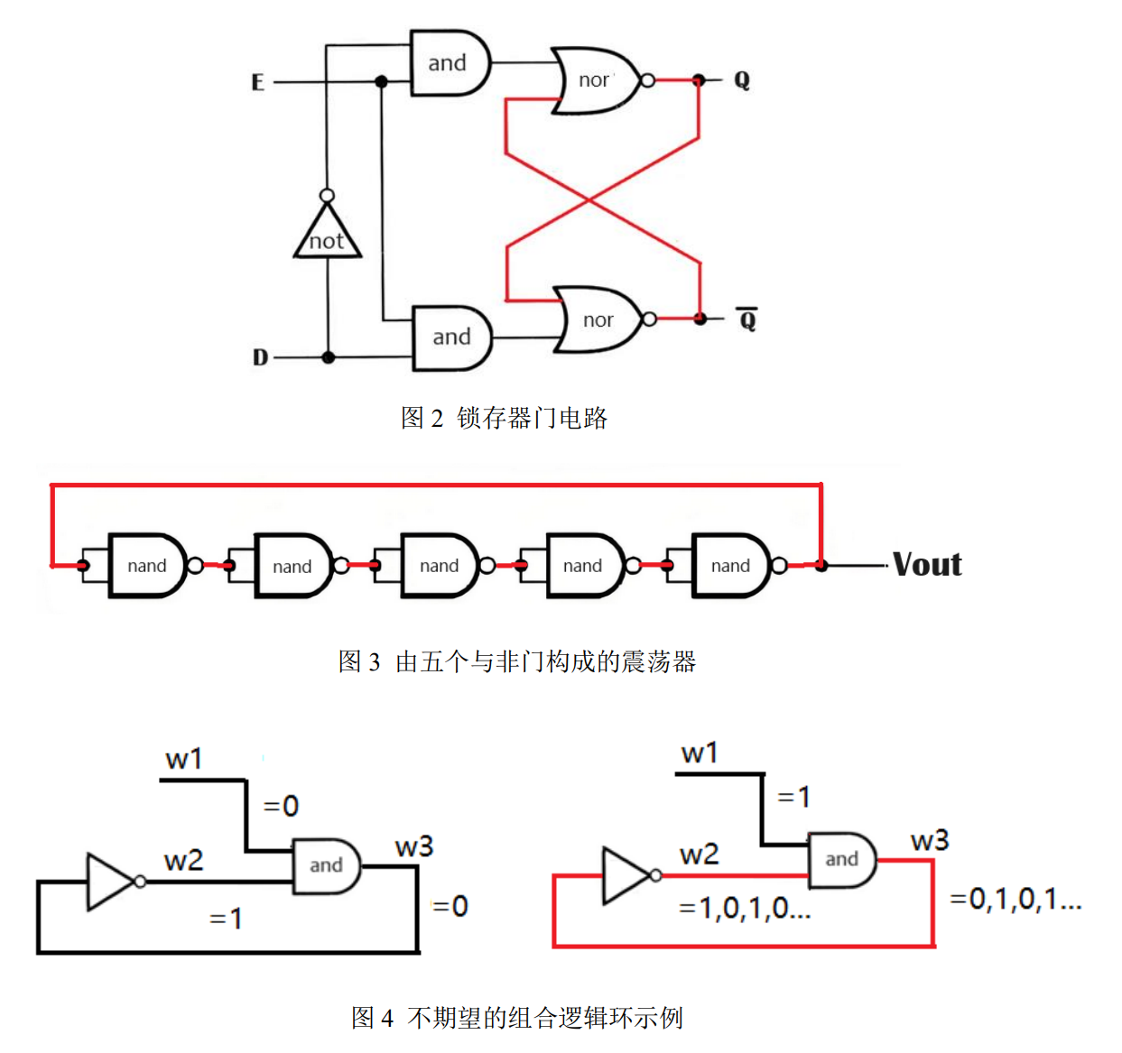 在组合逻辑电路中,起始于某个组合逻辑单元经过一串组合逻辑又回到起始组合逻辑单元的逻辑环路称为组合逻辑环路。组合逻辑环路分为正向反馈和负向反馈两种类型。正向反馈环路是指能够维持当前组合逻辑输出信号状态不变的反馈,常见于锁存器、寄存器和 SRAM 存储器单元等电路中。负向反馈环路是指将当前组合逻辑输出信号翻转的反馈,负向反馈环路会导致输出信号值不停翻转,常见于振荡器、伪随机数生成器等电路中。图 2 和图 3 为锁存器和振荡器门电路,其中红色信号线为锁存器和振荡器门电路中的组合逻辑环路部分。图 4 为不期望的组合逻辑环的示例图,当 w1 为 0 时,w2 为 0,w3 为 1;当 w1 为 1 时,w2 和 w3 将产生震荡。