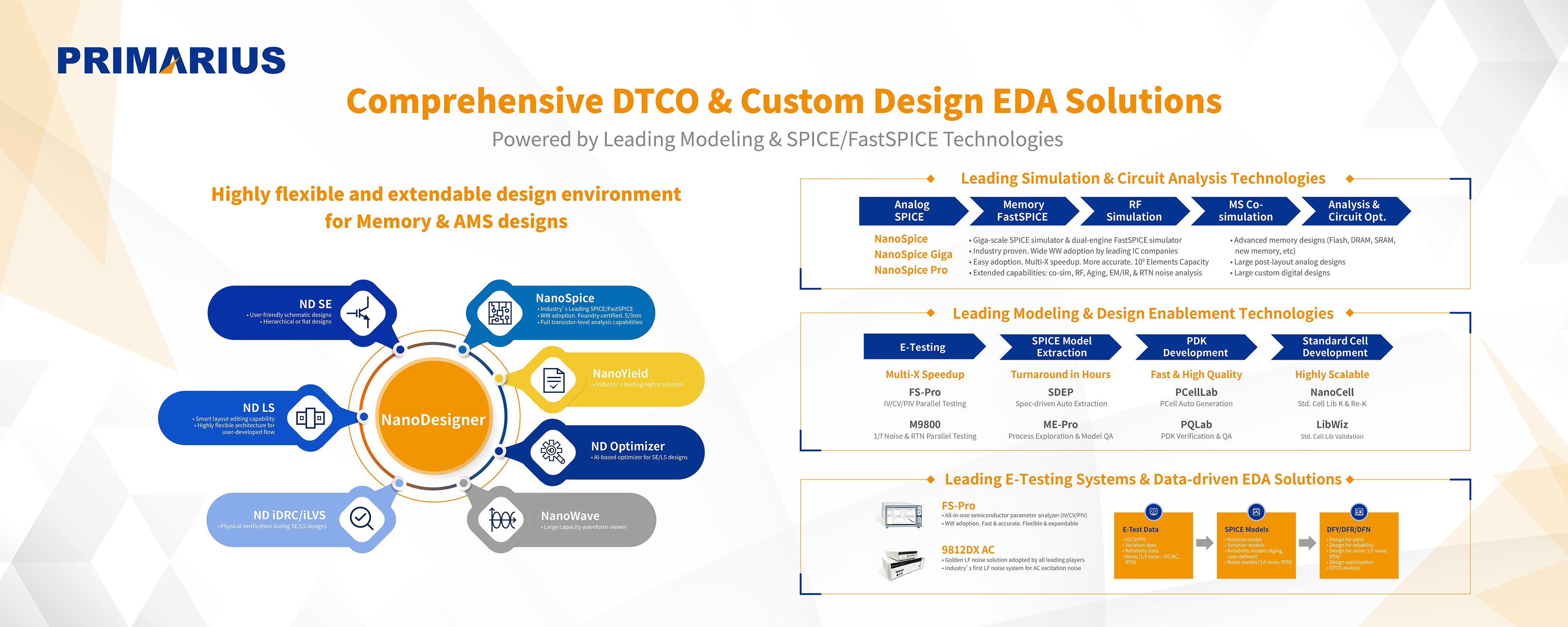 Primarius (688206.SH) is a global EDA company delivering industry’s leading design enablement technologies for advanced SPICE modeling, PDK generation and standard cell library characterizations, and a complete DTCO-enabled custom design EDA flow for complex memory, analog and mixed-signal designs. Powered by leading edge SPICE/FastSPICE simulation technologies, Primarius is committed to deliver innovative DTCO EDA solutions, with the mission to shorten time-to-market and improve YPPA of circuit designs at advanced process nodes, and unique data-driven EDA solutions, supported by full range of semiconductor parametric testing systems and industry’s golden low frequency noise testing systems.